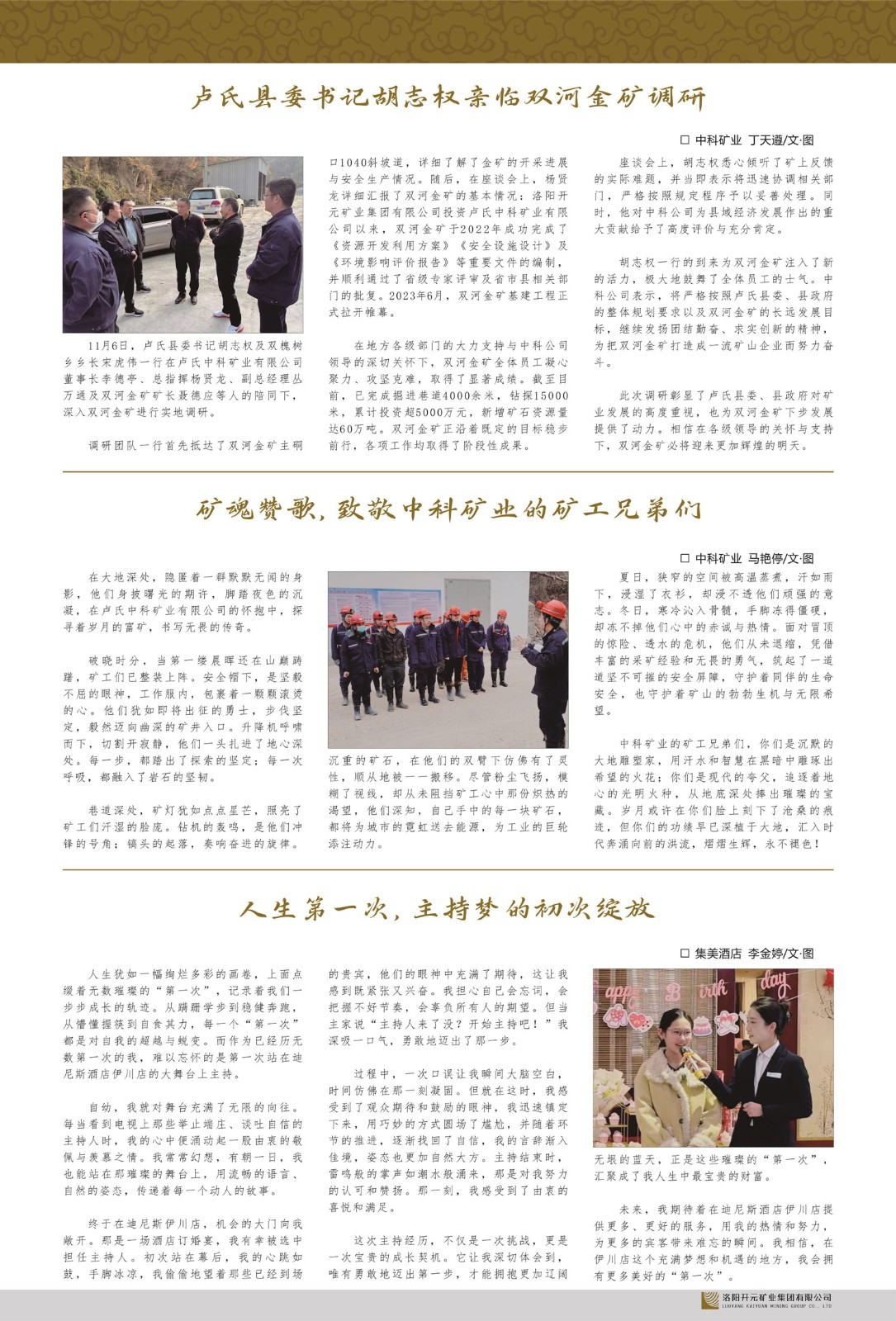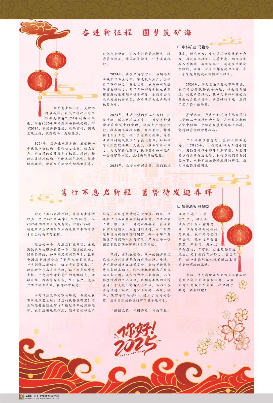 洛陽開元礦業(yè)集團(tuán)有限公司簡介洛陽開元礦業(yè)集團(tuán)有限公司,始成立于2006年,位于洛陽市開元大道269號(hào)。集團(tuán)旗下共有十余家全資子公司,業(yè)務(wù)涉及有色金屬礦山開發(fā)、礦產(chǎn)品購銷與進(jìn)出口貿(mào)易、房地產(chǎn)開發(fā)、文化藝術(shù)、企業(yè)管理與咨詢、資本投資等多個(gè)領(lǐng)域。2024年,集團(tuán)公司銷售總額達(dá)7.8億元。民建河南省委委員、民建河南省委企業(yè)委副主任、民建洛陽市委委員、企業(yè)委主任、洛陽民建企業(yè)家協(xié)會(huì)會(huì)長許明月是公司創(chuàng)始人,現(xiàn)任洛陽開元礦業(yè)集團(tuán)有限公司董事長。在礦業(yè)領(lǐng)域,洛陽開元礦業(yè)集團(tuán)擁有多家實(shí)力雄厚的子公司:貴州開元礦業(yè)有限公司探、采礦權(quán)面積共11.33平方公里;興??h銅鑫礦業(yè)有限公司探礦權(quán)面積8.76平方公里,礦山資源潛力巨大;2021年,開元集團(tuán)與盧氏中科礦業(yè)有限公司開展戰(zhàn)略合作。盧氏中科礦業(yè)有限公司專注于有色金屬的浮選、加工和銷售,擁有強(qiáng)大的技術(shù)支撐平臺(tái),是集探、采、選、冶、研為一體的中大型綜合礦業(yè)企業(yè)。目前,盧氏中科王家河1000噸選礦廠已成功投產(chǎn),雙河金礦、柳關(guān)欒盧鉛鋅礦相繼順利開工,樓房銀礦與圪老灣鉛鋅礦的深部探礦重大突破,標(biāo)志著礦山版圖取得重大進(jìn)展,為開元集團(tuán)后續(xù)發(fā)展奠定了堅(jiān)實(shí)基礎(chǔ)。在文化傳媒領(lǐng)域,洛陽市明月美術(shù)館通過豐富多樣的藝術(shù)展覽、學(xué)術(shù)研討和公共教育活動(dòng),努力打造一個(gè)集展覽、交流、教育、研究為一體的綜合性藝術(shù)平臺(tái)。此外,在金融投資領(lǐng)域,開元集團(tuán)旗下的北京明峰資本管理有限公司專注于投資具有高增長潛力的優(yōu)秀企業(yè),特別是高科技、新能源、環(huán)保等新興產(chǎn)業(yè),為客戶提供個(gè)性化的資產(chǎn)配置服務(wù)。在做好企業(yè)經(jīng)營的同時(shí),開元集團(tuán)始終不忘企業(yè)的社會(huì)責(zé)任和家國情懷,以突出的愛心公益事跡,開展了一系列公益慈善活動(dòng):“民建林”公益事業(yè)通過“思源基金”“幫幫公益”線上公益平臺(tái),與眾多愛心人士籌措資金20余萬元;資助541名貧困大學(xué)生共計(jì)270余萬元,推進(jìn)“數(shù)字助力——河南AI人才培養(yǎng)”;捐款10萬元,馳援京津冀、黑龍江洪水地質(zhì)災(zāi)害……公司于2017年底被洛陽市慈善總會(huì)評(píng)為“洛陽慈善風(fēng)云榜——十大愛心集體”。洛陽開元礦業(yè)集團(tuán)有限公司秉承持續(xù)發(fā)展理念,憑借多年來良好的企業(yè)信譽(yù)與經(jīng)營業(yè)績,與全國多家企業(yè)建立了良好合作關(guān)系,受到社會(huì)各界的一致好評(píng),多次榮獲“納稅標(biāo)兵”“先進(jìn)企業(yè)”“招商引資模范企業(yè)”等榮譽(yù)稱號(hào)?;赝麃頃r(shí)路,開元人勠力同心,以“闖”的精神和“創(chuàng)”的勁頭,一路披荊斬棘,踏過千山萬水;展望新未來,開元人凝心聚力,不執(zhí)于“舊”,無畏于“新”,秉承“勇于跨越,追求卓越”的企業(yè)精神,乘著國家高質(zhì)量發(fā)展新征程的東風(fēng),跨過高山,越過大海,向著集團(tuán)多元化、國際化的目標(biāo),逐夢遠(yuǎn)航,跨越前行!